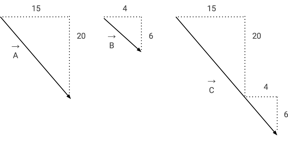 Soit deux vecteurs A(15, 20) et B(4,6). Soit C le résultat de leur addition. Alors C correspond à l’addition de leurs composants entre eux :