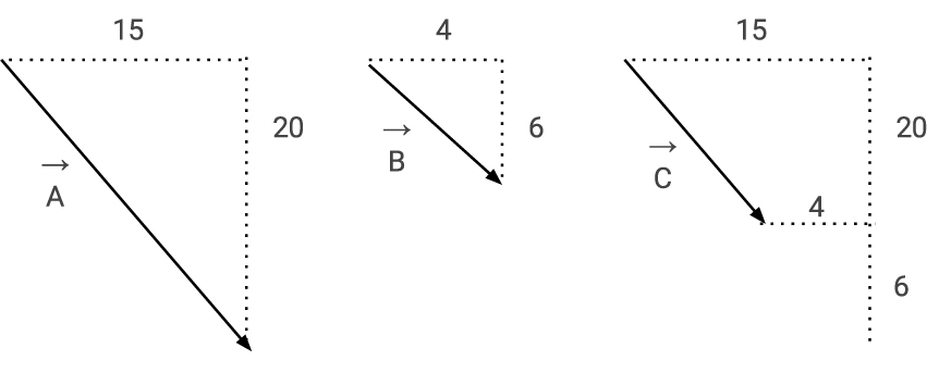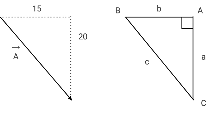 Si on observe le vecteur ci-dessus on remarque que ce dernier peut être décrit comme le triangle rectangle ABC dont la longueur du côté opposé à l’angle CBA est a = 20 et dont la longueur du côté adjacent à l’angle CBA est b = 15. Enfin le côté c correspond à l’hypoténuse du triangle ABC. Or on sait par le théorème de Pythagore que l’hypoténuse est égale à la racine de l’addition du coté opposé au carré par le côté adjacent au carré soit :