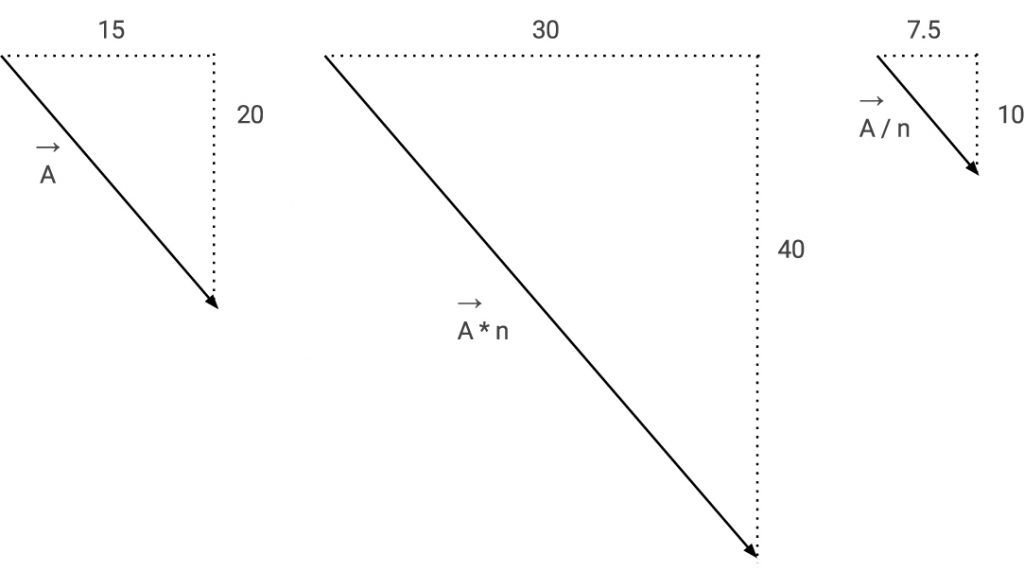 La multiplication et division sont des opérations différentes quand il s’agit de calcul vectoriel. En effet lorsque l’on parle de multiplication et division de vecteur nous parlons de modifier l’échelle de ce dernier, c’est-à-dire d’en changer sa magnitude — pour rappel la magnitude d’un vecteur correspond à sa longueur. Ainsi nous ne multiplions ou divisons un vecteur que par un nombre décimale. En mathématiques le nombre qui multiplie ou divise un vecteur est appelé scalaire.